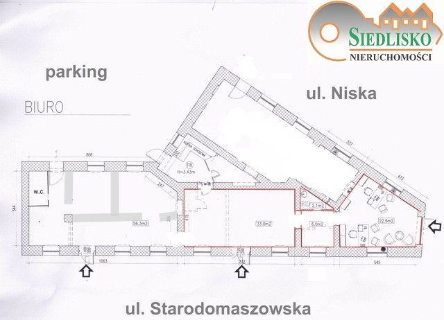 OpisProponujemy do wynajęcia lokal usługowy na parterze kamienicy, położonej w centrum Kielc przy ul. Niskiej 2H. Całkowita powierzchnia parteru to 165 m2 5 większych pomieszczeń, 3 toalety, łazienka, korytarz. Do lokalu mamy 3 bezpośrednie wejścia od ulicy, dwa od parkingu z placu przy kamienicy oraz jedno z klatki schodowej. We wszystkich pomieszczeniach na podłogach terakota, w oknach żaluzje zewnętrzne antywłamaniowe. Lokal wyposażony w instalację elektryczną, c.o. - gazowe, wodno-kanalizacyjną. Nieruchomość jest usytuowana w niezwykle dogodnej lokalizacji pomiędzy dwoma galeriami handlowymi "Koroną" i "Echo", w bliskiej odległości i z dogodnym dojazdem do Sądu, Urzędu Miasta i Urzędu Wojewódzkiego. Kamienica położona jest przy skrzyżowaniu ulic o dużym natężeniu ruchu kołowego jak i pieszego. W obrębie budynku znajdują się miejsca postojowe. Bardzo dobre połączenie z centrum miasta i innymi dzielnicami Kielc. Lokal na każdą działalność typu gabinety, biura, kancelarie adwokackie/notarialne, biuro projektowe, itp. .